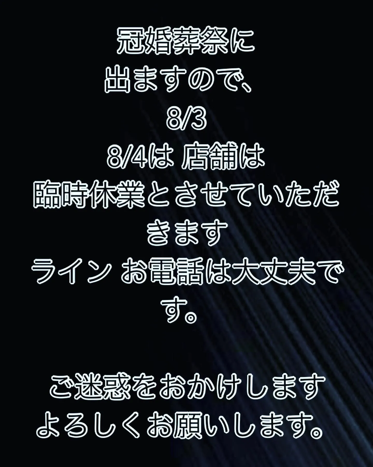 8/3 8/4 は 冠婚葬祭のため、 2023/08/02 8/3 8/4 は 冠婚葬祭のため、 店舗販売臨時休業となります。 ご来店いただいてもシャッターおりますので、お気をつけくださいませ。 8/5からまた通常営業です。 ご迷惑をおかけしますが、ご了承のほど、よろしくお願いします。