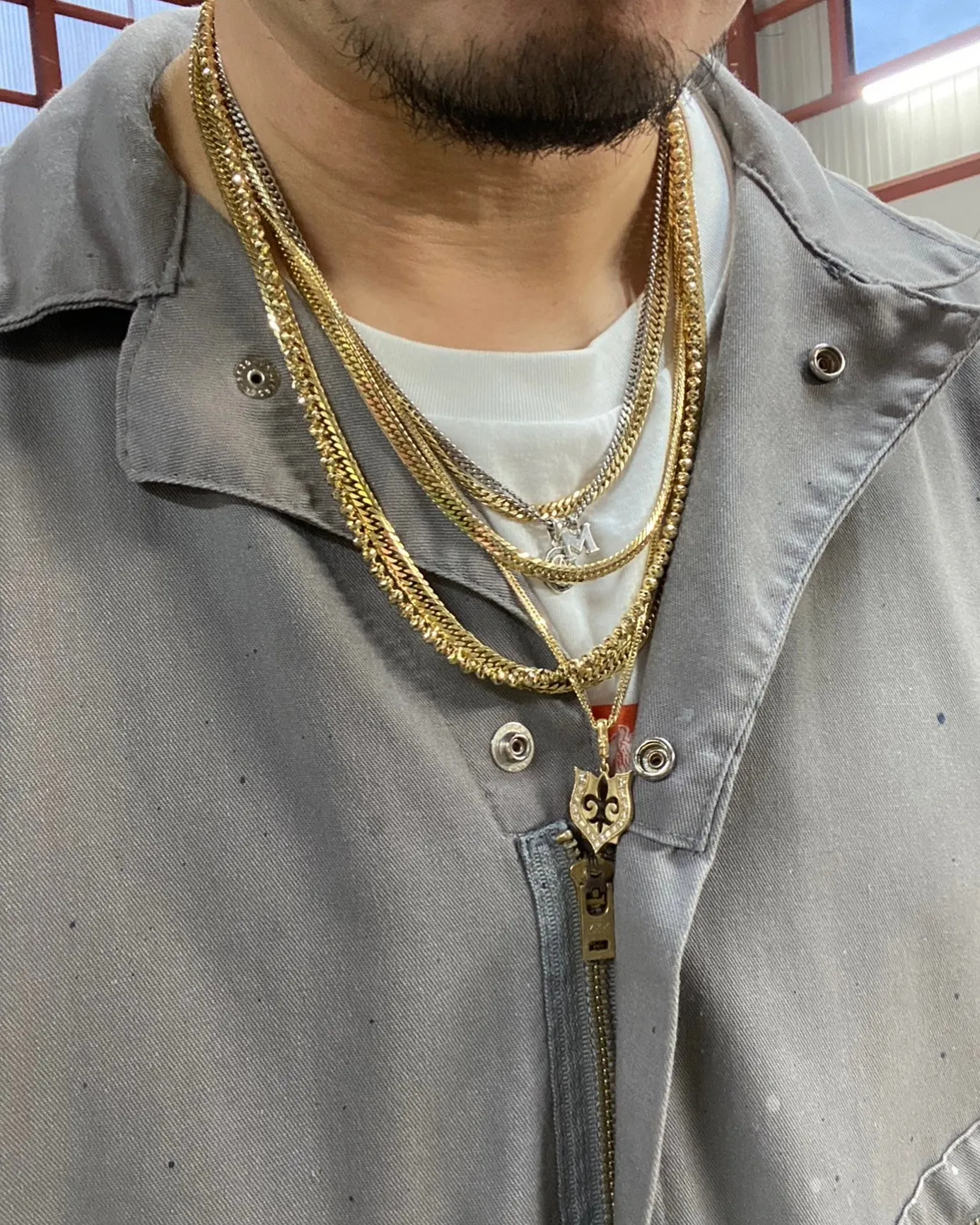 あえてガサっとつけることで、計算されていない、かっこいいものを片っ端からつけてるというような玄人感が滲み出る