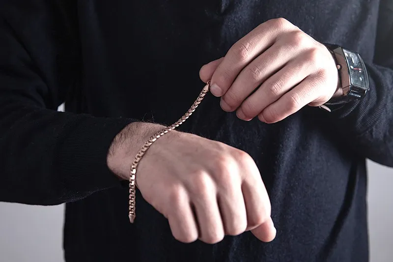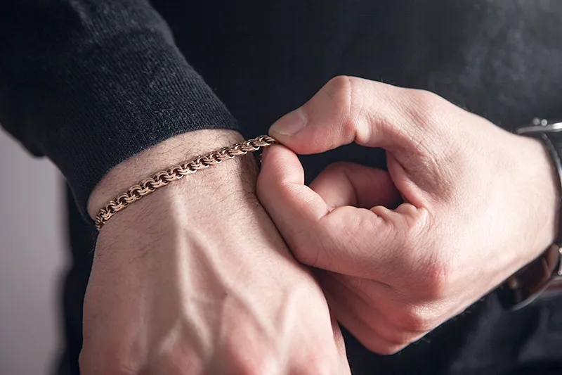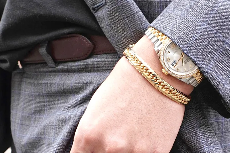 18金の喜平ブレスレットは、他のブレスレットと組み合わせることで、多彩なコーディネートが楽しめます。例えば、シンプルな18金喜平ブレスレットに、細めのゴールドチェーンブレスレットやビーズブレスレットを重ねることで、よりカジュアルでリラックスした印象を与えます。一方、ダイヤモンドや宝石があしらわれたブレスレットと組み合わせると、豪華さとエレガンスが一層引き立ちます。重要なのは、全体のバランスを崩さないようにすることです。異なる素材やデザインのブレスレットを組み合わせる際には、色味や質感を統一することがポイントです。また、ブレスレットの幅や長さにも注意を払い、手首のボリューム感を調整しましょう。喜平ブレスレットはその独特なデザインと輝きが特徴ですが、他のブレスレットと合わせることで、より個性的なスタイルを楽しむことができます。シンプルなTシャツやデニムスタイルにも、複数のブレスレットを取り入れることで、ワンランク上のファッションが完成します。