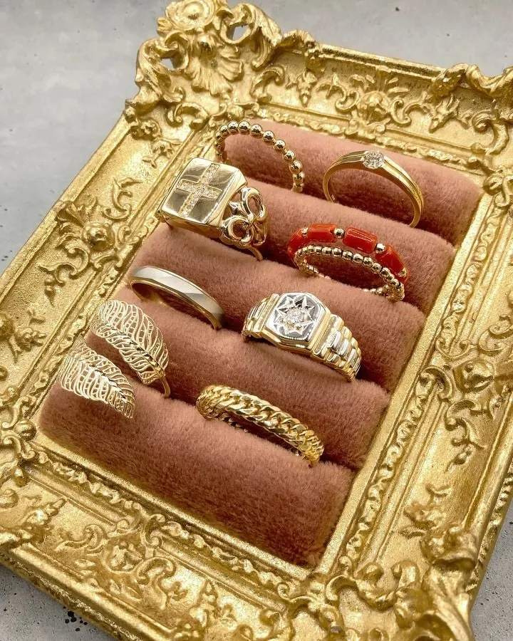 日常使いに適した18金リングのデザインは、多様なスタイルやシーンに対応できるよう工夫されています。シンプルなソリッドリングは、どんなファッションにも合わせやすく、オフィスやカジュアルなシーンでも一際目を引きます。また、細身のリングにダイヤモンドや他の宝石をあしらったデザインは、控えめながらも上品で洗練された印象を与えます。18金リングは、その高い耐久性と変色しにくさから、毎日の使用に適しています。さらに、エッチングや模様が施されたデザインは、個性を表現するのに最適です。こうした多様なデザインが揃っている18金リングは、日常を一層ラグジュアリーに彩ります。