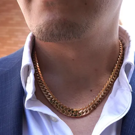 フォーマルなシーンでも、18金6面カットダブル喜平チェーンはその存在感を放ちます。スーツやドレスといったエレガントな装いに合わせることで、さらに高級感を演出します。18金の素材は長持ちし、その美しい輝きがフォーマルなイベントでも大いに活躍します。6面カットの特性により、光の反射が美しく、室内外問わずどの角度から見ても洗練された印象を与えます。特に、ネックラインが見えるデザインのドレスに合わせると、その美しいデザインが強調され、上品さが際立ちます。