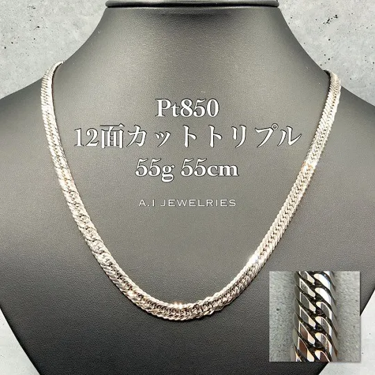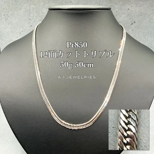 プラチナ850の12面カットトリプル喜平ネックレスは、その光の反射が生み出す輝きが特筆すべき特徴となっています。12面カットという高度な技術は、光を自在に操り、まるでジュエリー全体が光を放っているかのような幻想的な輝きを実現します。このカット技術は、光の反射角度を計算し、宝石のように輝かせることを可能にしています。さらに、トリプルのデザインにより、ネックレスが動くたびに違った表情を見せてくれるため、見る者を飽きさせることがありません。このように、12面カットトリプルのデザインは、プラチナの美しさをより際立たせ、特別な瞬間を共に彩るアクセサリーとして最適です。