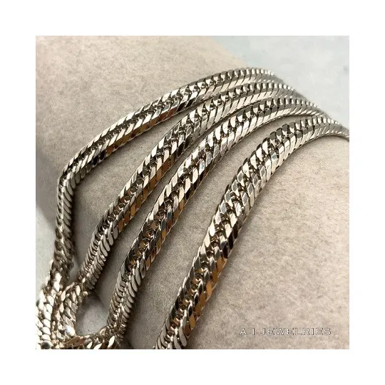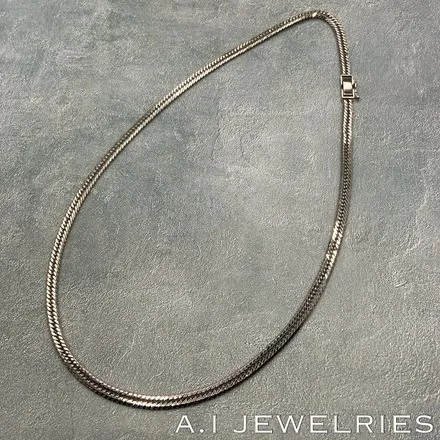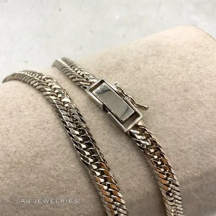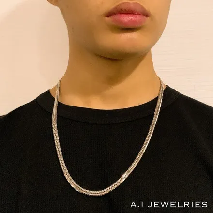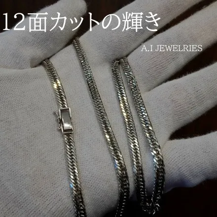 12面カットトリプルの喜平ネックレスは、その名の通り12面にカットされたリンクが特徴です。このデザイン技術により、プラチナ850の金属が持つ自然な輝きを最大限に引き出すことができます。12面カットによって光が多方向に反射し、動くたびに異なる表情を見せるため、一つひとつのリンクがまるで生きているかのように感じられます。このトリプルのデザインは、複数のリンクが重なり合い、立体感と奥行きを生み出すことで、より豊かな装飾性を持たせています。デザインの細部にわたるまで計算されたこの喜平ネックレスは、職人の技術とセンスが結集した逸品です。