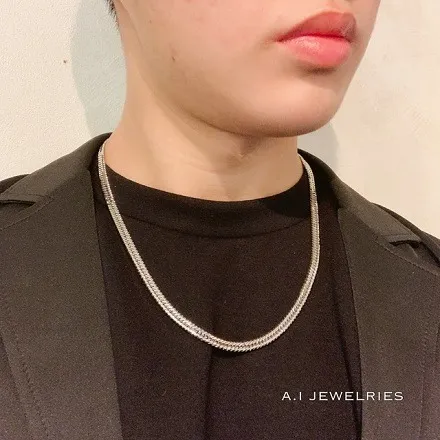 喜平チェーンのデザインは、その普遍性と多機能性で多くの人々から支持されています。まず、そのシンプルながらも強い存在感は、どんなスタイルにも合わせやすく、デイリーからフォーマルまで幅広いシーンで活躍します。また、プラチナ850素材の喜平チェーンは、その輝きと耐久性が特に評価されています。プラチナは酸化や変色に強い特性を持つため、長く美しい輝きを保ち続けます。さらに、12面カットによる精巧なデザインが、光を様々な方向に反射し、動きに応じてダイナミックな輝きを放ちます。このような特徴により、喜平チェーンは時を超えて愛され続けるアクセサリーとして多くの支持を集めているのです。