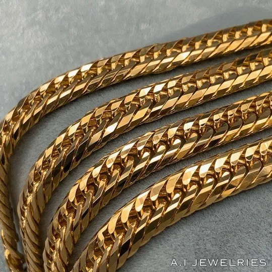 18金20面カットトリプルネックレスの魅力の一つは、そのトリプルデザインにあります。これにより、シンプルな一連のネックレスでは得られない重厚でエレガントな印象を演出します。18金という素材自体の光沢感と、20面カットの複雑な輝きが組み合わさることで、トリプルデザインがさらなる立体感と深みをもたらします。各チェーンが異なる角度で光を反射し、動くたびに様々な表情を見せるので、どんなシーンでも存在感を失いません。このユニークなデザインは、特別な日の装いにも、日常のスタイルアップにも適しています。さらに、トリプルデザインのネックレスは、他のジュエリーとの相性も良く、重ね付けがしやすいのが特長です。