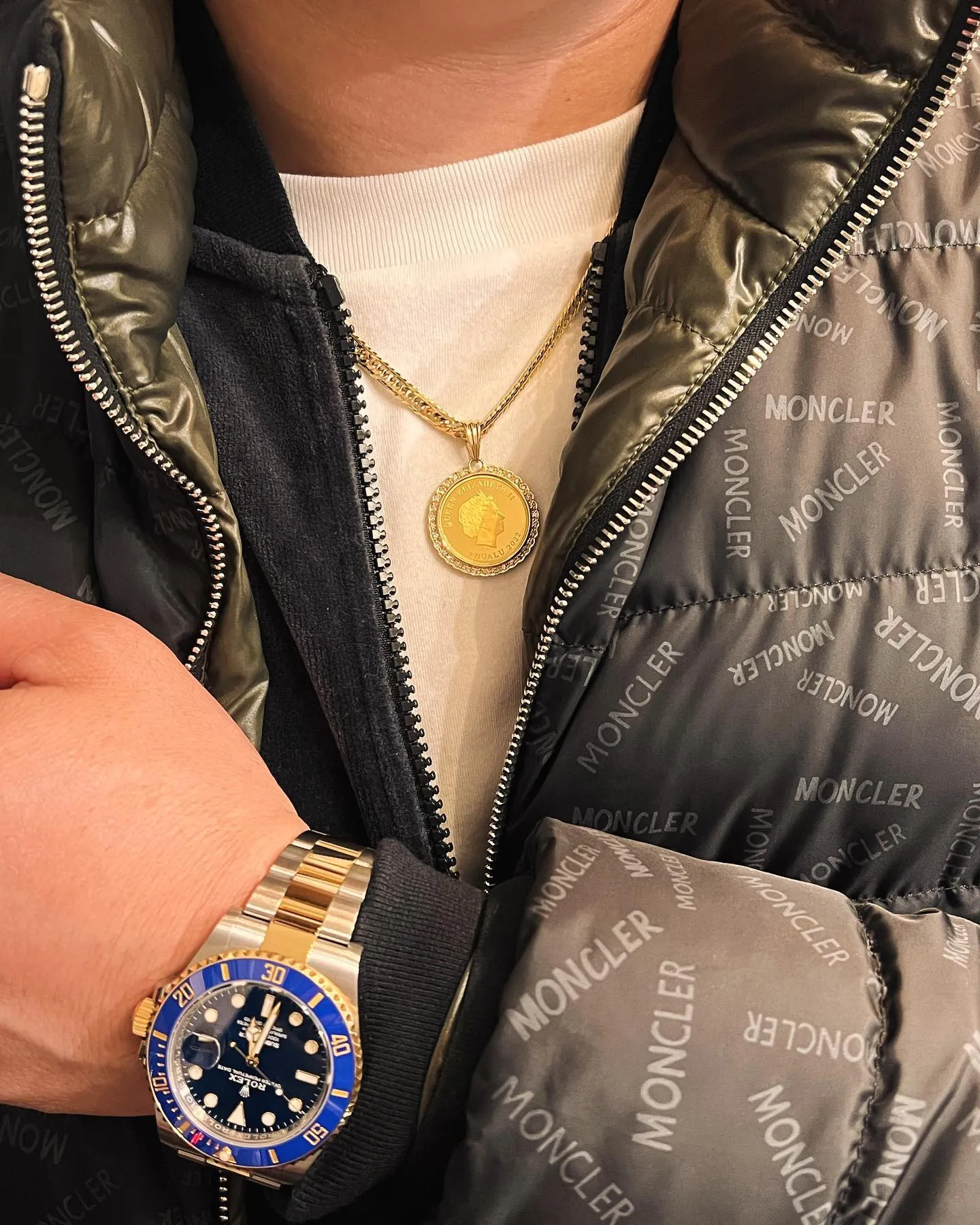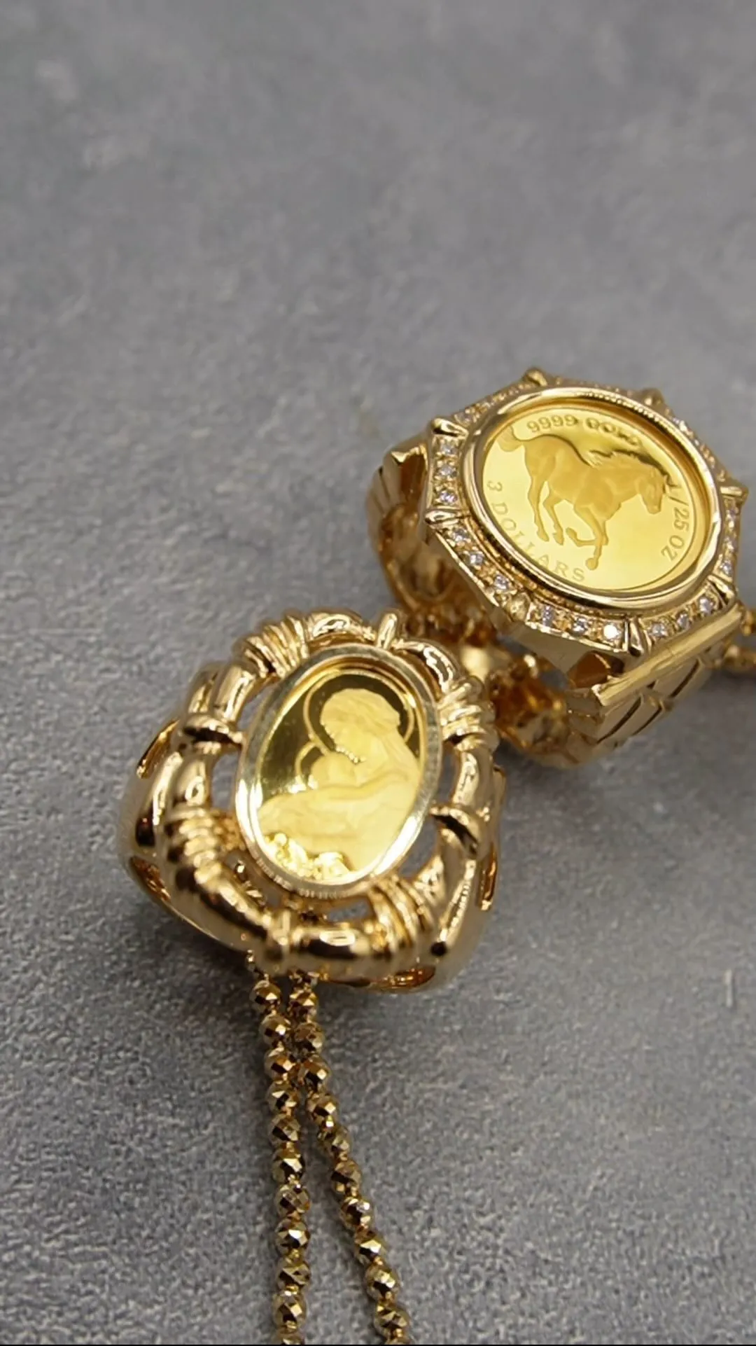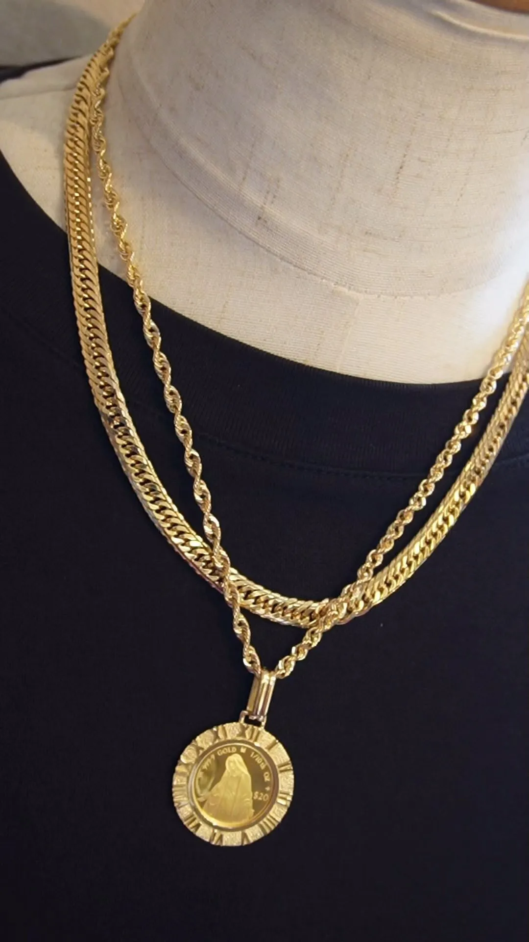 K18/K24本物のゴールド⁎⁺˳✧༚1/2ozのパワフルな輝きが魅力的──K24のコイン部分は柔らかいため、傷つきやすいですが時間と共に変わりゆく質感は愛着を感じさせます大きめにコインは55cmや60cmの、太めのロ…