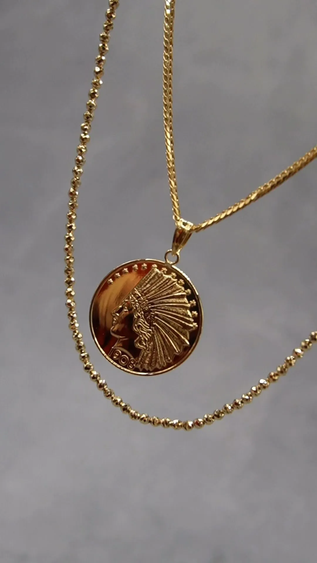 K18インディアンペンダント⁎⁺˳✧༚インディアンデザインのプレスコインのご紹介です🧚◎インディアンペンダント品番kp-indian総重量約1.3g10g程度の喜平が通るバチカンサイズ◎6面カットダブル11g55cm品番k6w-…