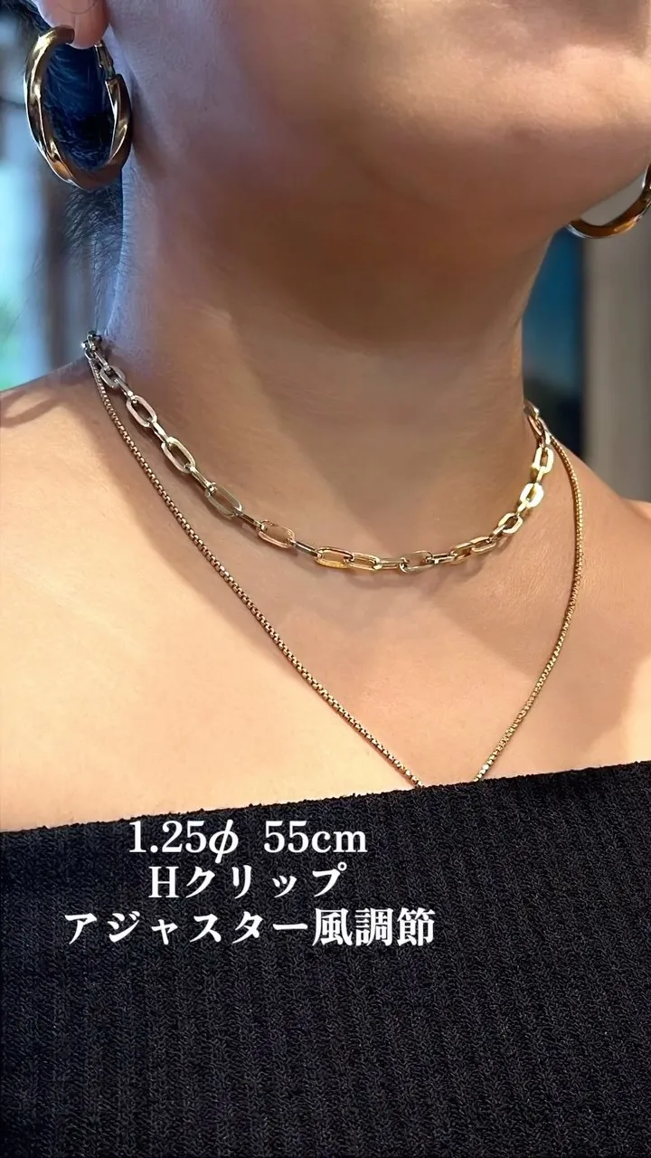 K18ゴールドジュエリー✨kpch125-50ゴールドの抜け感がちょうどいい1.25φのボリュームのあるゴールドカラーが洗練された首元を演出。チェーンに引き輪を通す、アジャスター風の着用方法で重ね付けも自由自…