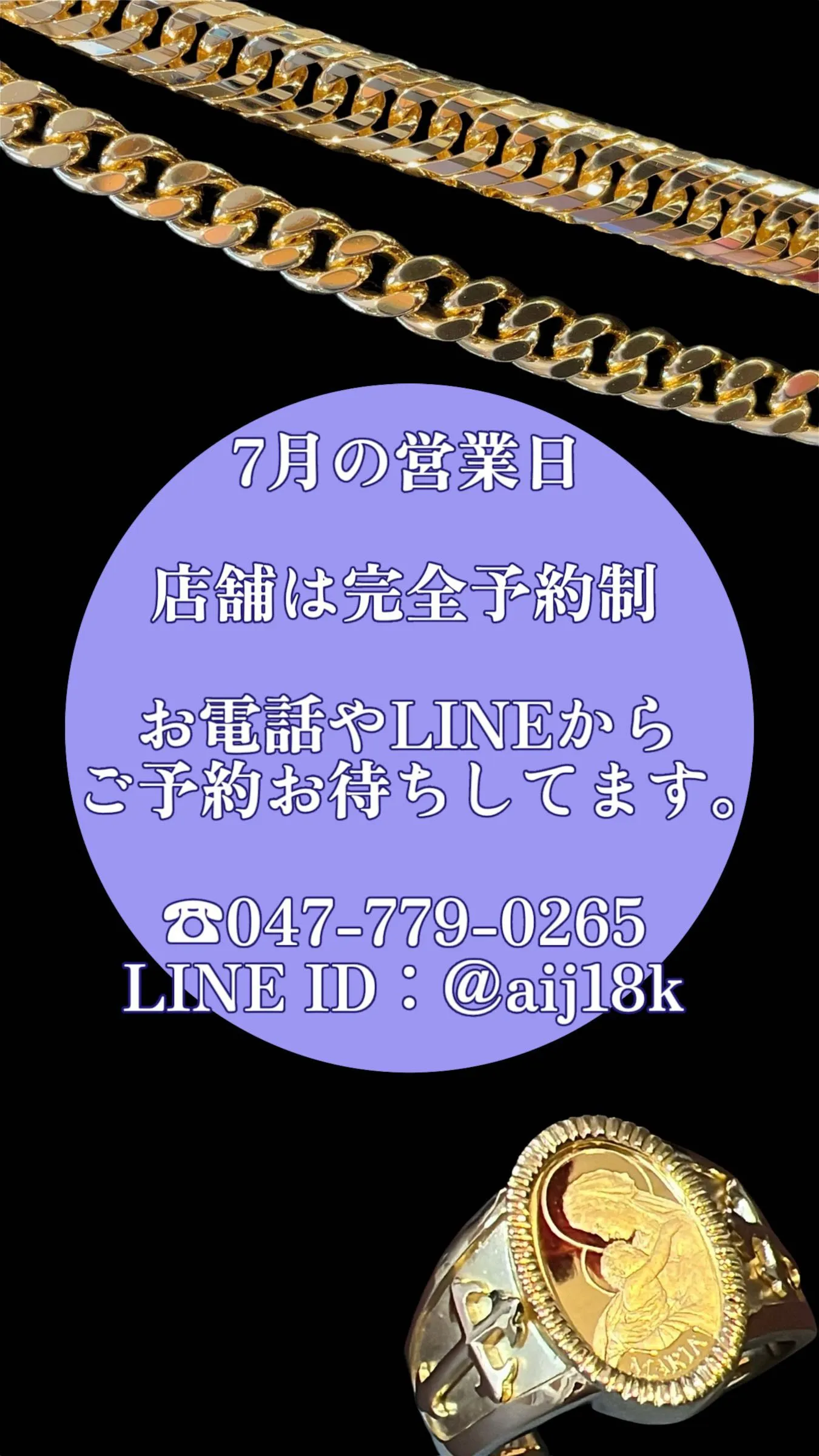 K18&プラチナ専門店千葉県船橋市のジュエリーショップA.IJEWELRIES(エイアイジュエリーズ)7月の営業日お知らせ🔔事前のご予約&在庫確認「これから行きます!」の電話お待ちしてます😊_____「ネット…