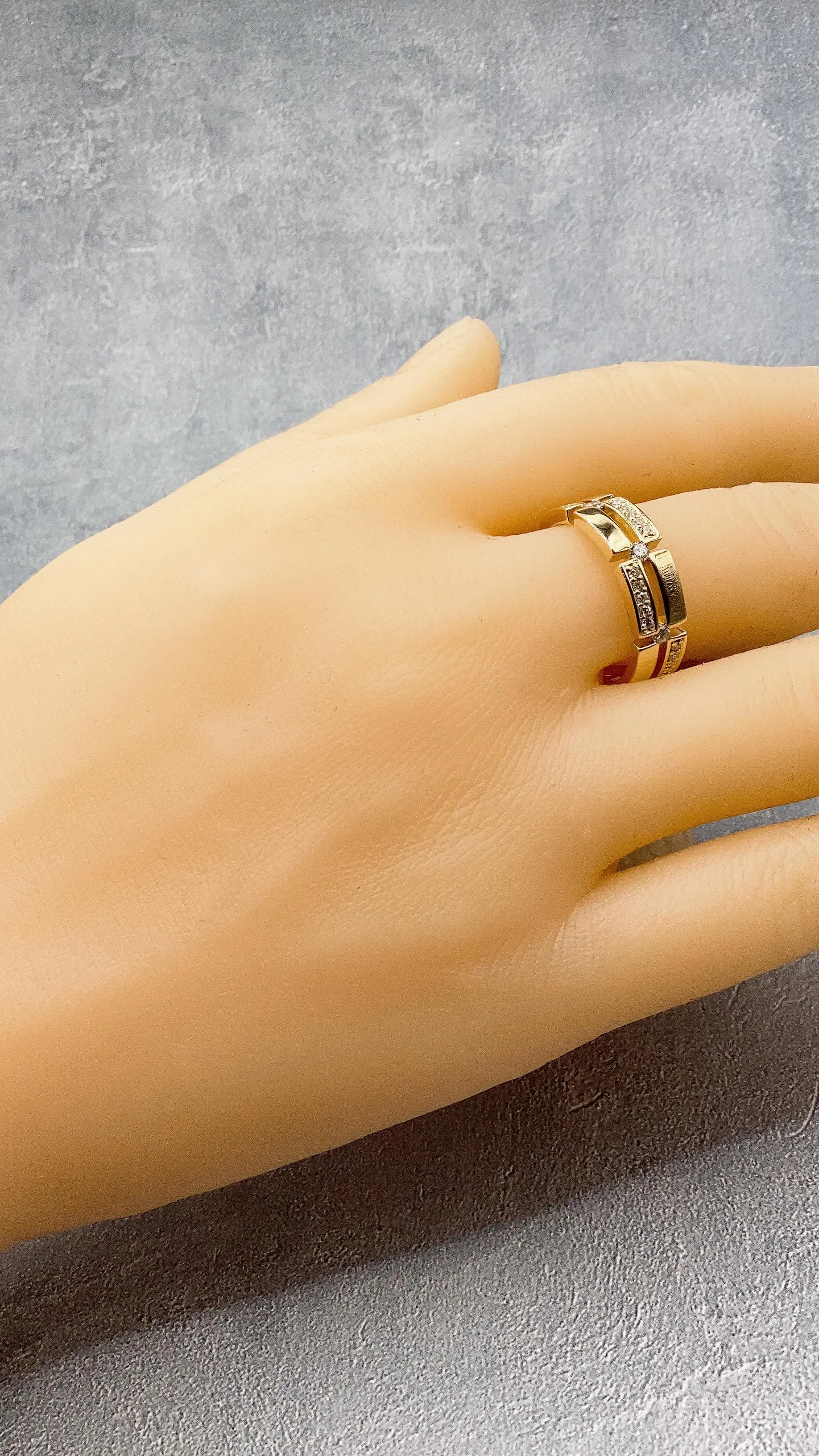 k18 デザインリング⁎⁺˳✧༚ k18デザインリング⁎⁺˳✧༚スペースのあるデザインとダイヤモンドが目を惹きます🌟等間隔に配置されたダイヤモンドがシンメトリーであり、アシンメトリーなデザイン💍奥行きを感じられるデザインで、手元が美…