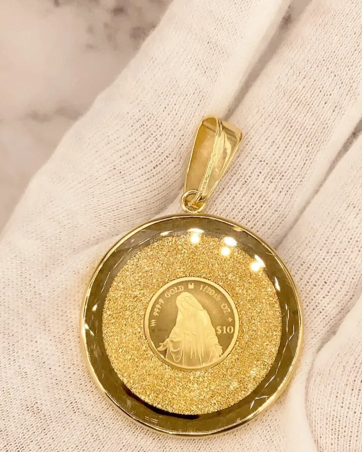 K18 ガラス付きコインペンダント⁎⁺˳✧༚ K18ガラス付きコインペンダント⁎⁺˳✧༚◎K18/K24ガラス付きマリアペンダント品番pt-070-gmxl総重量20.0g1/20ozガラスの金メダル、という感じですね…かなり映えます😎100gに通る大きめバチカンがついています…