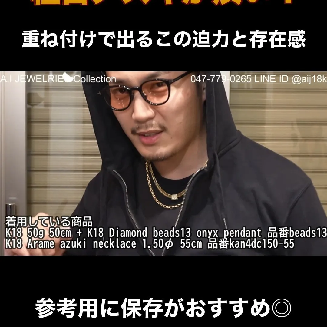 重ね付けで一気に格が上がるこの迫力と存在感。 重ね付けで一気に格が上がるこの迫力と存在感。50g50cm喜平をお持ちの方におすすめの最強コーデ。ダイヤモンドビーズ×オニキスペンダント×アズキネックレスで、シンプルなのに圧倒的にかっこいいバランス…