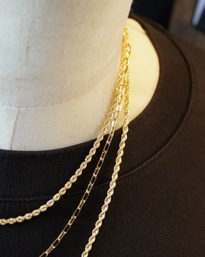 K18 エイアイジュエリーズ⁎⁺˳✧༚ K18エイアイジュエリーズ⁎⁺˳✧༚3mmロープコーデ⁎⁺˳✧༚シャイニーロープとはまた違う滑らかな編み込みが美しいロープネックレスを贅沢にも3連着けて...いや、違うかも...そうだ‼️真ん中だけをミラノペーパー…